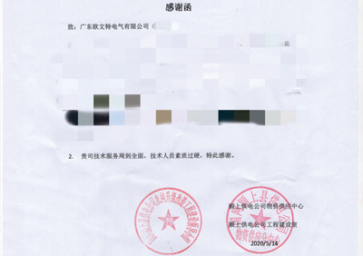 【喜訊】歐文特電氣收到了國家電網(wǎng)的書面感謝函